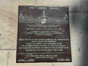 このキューピッド像の近くにはこの1879-80年シドニー万博、ならびに、「ガーデン・パレス」に関する銘板が床に埋め込まれている。