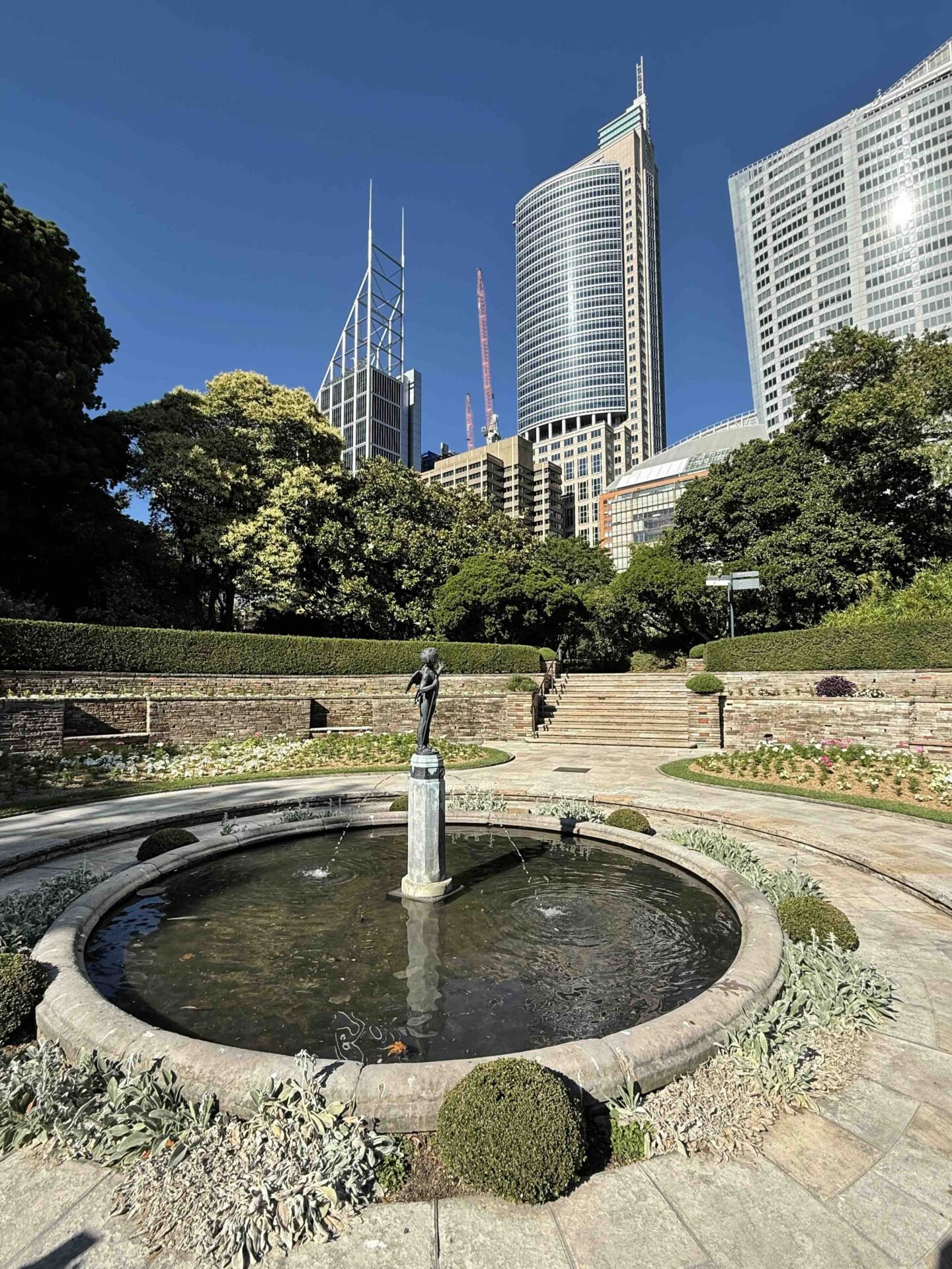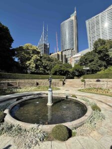この由緒ある1879-80年シドニー万博の跡地、「パイオニア・メモリアル・ガーデン」も、西側を望めば、背後に近代的なビル群が聳え立っているのが見える。